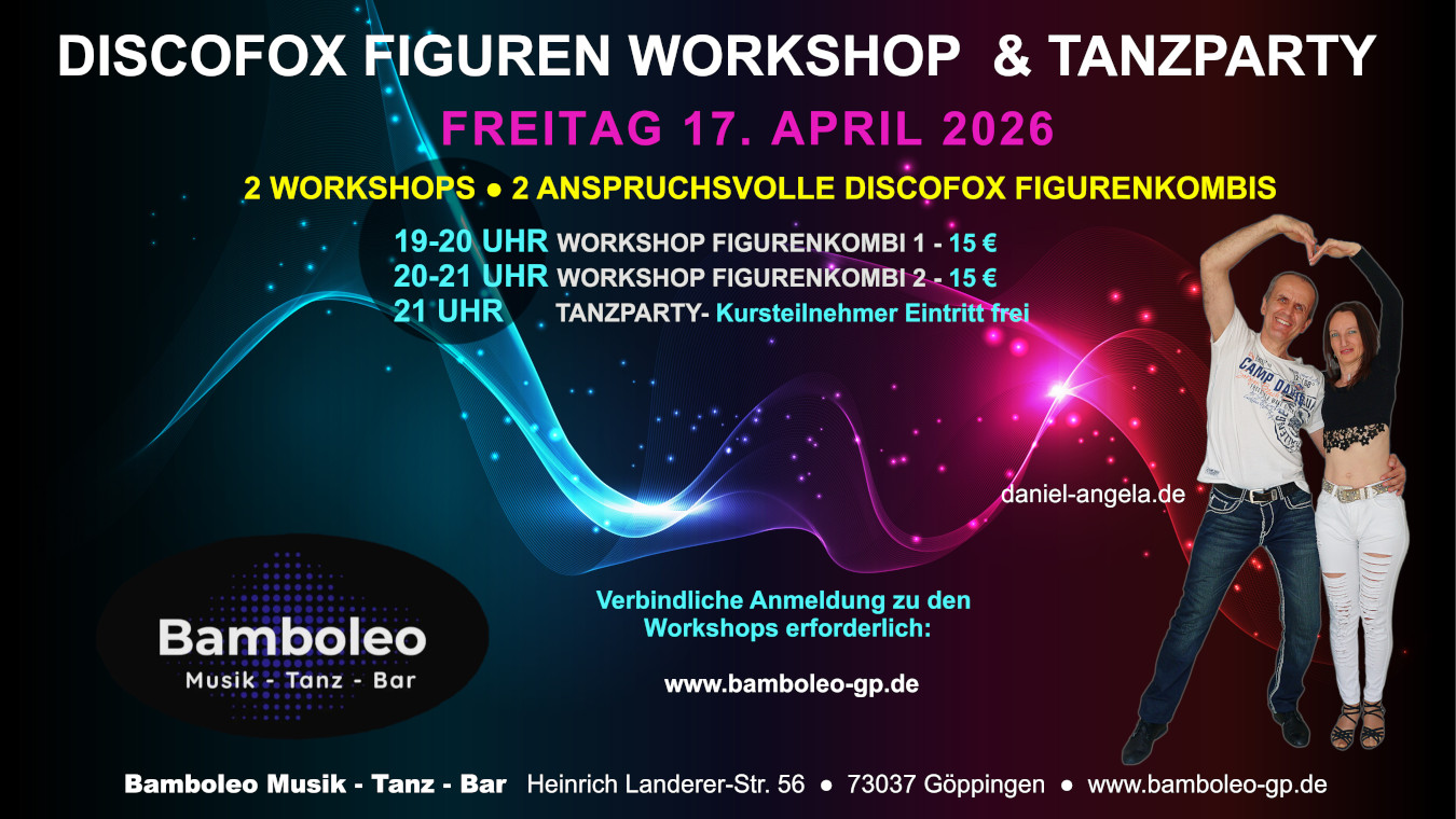 2 Discofox Figuren Workshops & Tanzparty in der Tanzbar Bamboleo in Göppingen Erlebt mit uns einen mitreißenden Abend voller Tanz, Kreativität und Spaß im Bamboleo in Göppingen. In der ersten Workshopstunde zeigen wir euch, Schritt für Schritt, eine Figurenkmobi für Anfänger die sich auf jeder Tanzfläche sehen läßt. Unser zweiter Discofox Figuren Workshop richtet sich an FORTGESCHRITTENE Tanzpaare die auf der Suche nach Eyecatcher-Figuren und Coole Moves sind. Mit unseren anspruchsvollen Figurenkombis, die bereits Millionen Mal auf Social Media angeschaut wurden, konnten wir bereits weltweit hunderte Paare begeistern und inspirieren. Kommt zu unseren Workshops und überzeugt euch selbst. Ihr werdet es lieben :) Wir freuen uns auf euch :) Daniel & Angela |