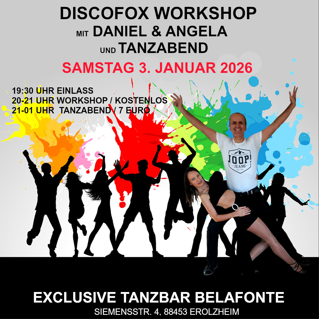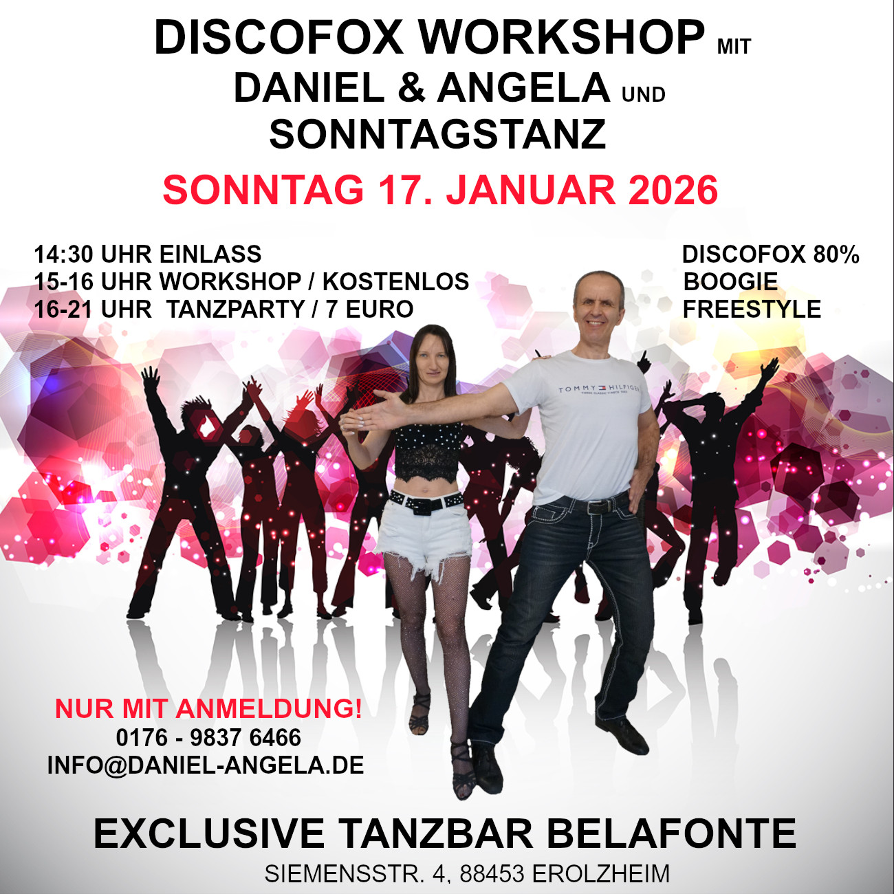 ACHTUNG, NUR MIT ANMELDUNG! Herzlich Willkommen zu unserem DISCOFOX WORKSHOP und zum anschließenden SONNTAGSTANZ mit KAFFEE und KUCHEN Bei unserem Workshop zeigen wir euch Schritt für Schritt eine fantasievolle Choreo bei dem der Blickfang auf der Tanzfläche bestimmt garantiert ist. Im Anschluß daran geht die Party ab und wir lassen mit euch das Tanzbein schwingen. Auf euch freuen sich Daniel & Angela & das Belafonte Team! Ihr werdet es lieben :) |
