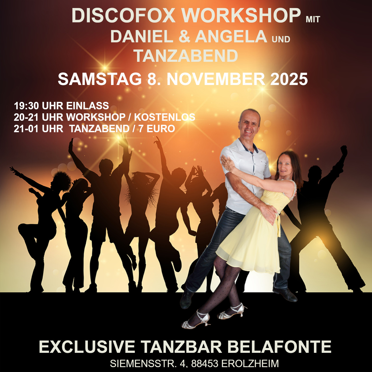 DISCOFOX FIGURENWORKSHOP mit anschließendem TANZABEND in der Exclusiven Tanzbar Belafonte in Erolzheim Wollt ihr neue Discofox Figuren lernen? Bei unserem Figuren Workshop am Samstag, den 1. November, zeigen wir euch Schritt für Schritt eine fantasievolle Figurenkombi bei dem der Blickfang auf der Tanzfläche bestimmt garantiert ist. Ihr werdet es lieben :) |