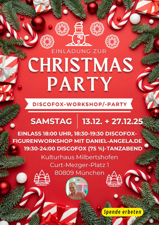 DISCOFOX- und TRIO FOX-WORKSHOPS mit anschließerden Tanzpartys im Kulturhaus Milbertshofen in München Aus unseren fantasievollen Choreos, haben wir auch dieses mal schöne Figurenkombis herausgesucht die wir euch gerne, in unseren Discofox- und Trio Fox-Workshops, Schritt für Schritt erklären möchten. Nach den Workshops finden die jeweiligen Tanzpabende unter dem Motto Black & White Party und Christmas Partys vom Veranstalter und DJ Manfred statt. Getanzt wird Discofox 75%, Boogie, Walzer, Rumba, Cha Cha, Salsa, Tango, Freestyle. Ihr könnt euch jetzt schon darauf freuen :) |