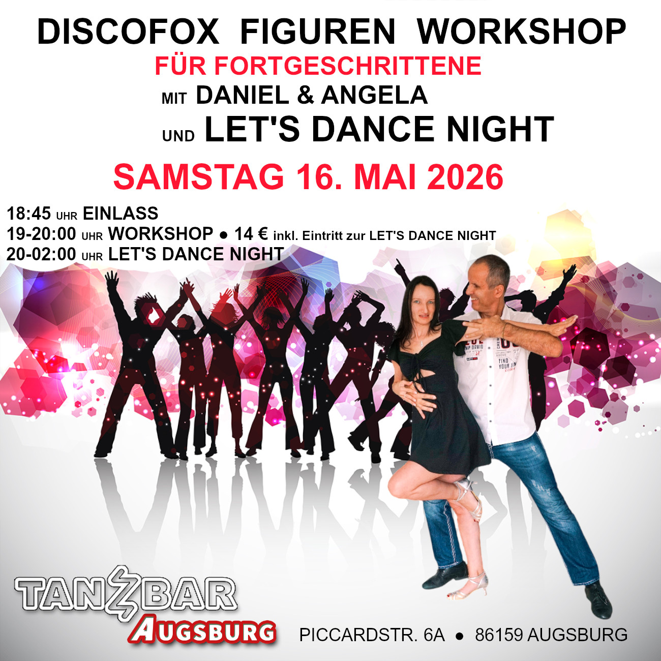 Es ist für uns eine große Freude, unseren DISCOFOX FIGUREN WORKSHOP in dieser wunderschönen Tanzlocation zu unterrichten. Ihr könnt euch jetzt schon auf eine fantasievolle Choreo aus unserem Programm freuen, bei der der Blickfang auf der Tanzfläche bestimmt garantiert ist. Im Anschluss daran findet die LET'S DANCE NIGHT statt, mit einem abwechslungsreichen Discofox- und Tanz Musik-Mix, bei dem wir gemeinsam mit euch, das Tanzbein schwingen lassen werden. Gemeinsam mit dem Team von der Tanzbar in Augsburg freuen wir uns auf euch ! Ihr werdet begeistert sein :) |